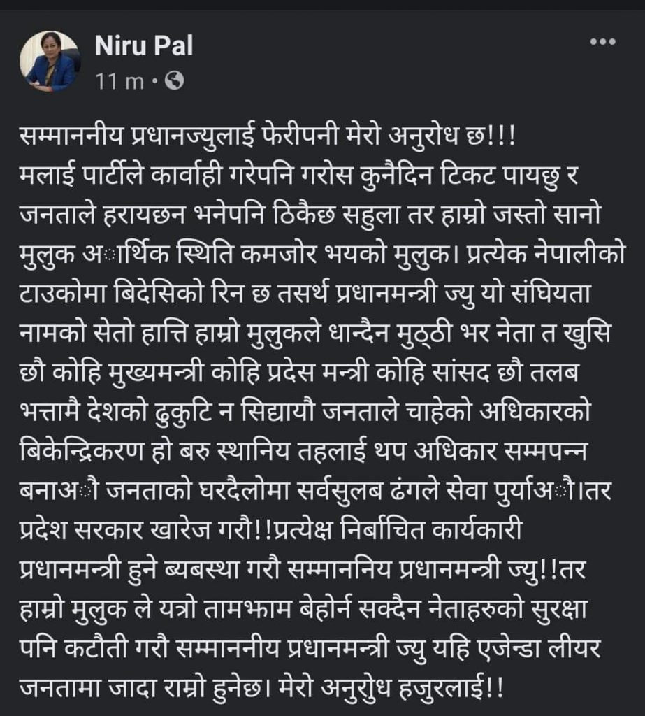 हेरौँ नेतृ निरु पाल ले सामाजिक सञ्जाल फेसबुकमा आफ्नो बिचार राख्दै प्रधानमन्त्री ओली लाई दिएको सुझाव जस्ताको त्यस्तैः