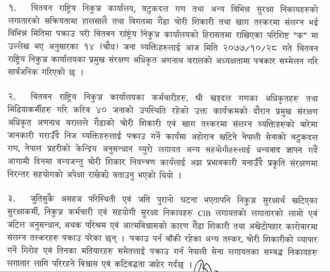 बुधबार चितवन राष्ट्रिय निकुञ्ज कार्यालयले पत्रकार सम्मेलन गरेर तस्करीमा संलग्न १४ जनालाई सार्वजनिक गरेको हो । निकुञ्जका प्रमुख संरक्षण अधिकृत अणनाथ बराले पत्रकार सम्मेलन गरेर तस्करीमा संलग्न १४ जनालाई सार्वजनिक गरेका हुन् ।
