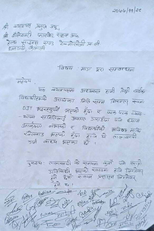 धनगढी: धनगढीको शैलेश्वरी फारवेस्ट स्कुल अफ हेल्थ साइन्स एण्ड टेक्नोलोजी प्रालिमा विद्यार्थीहरुले तालाबन्दी गरेका छन्।