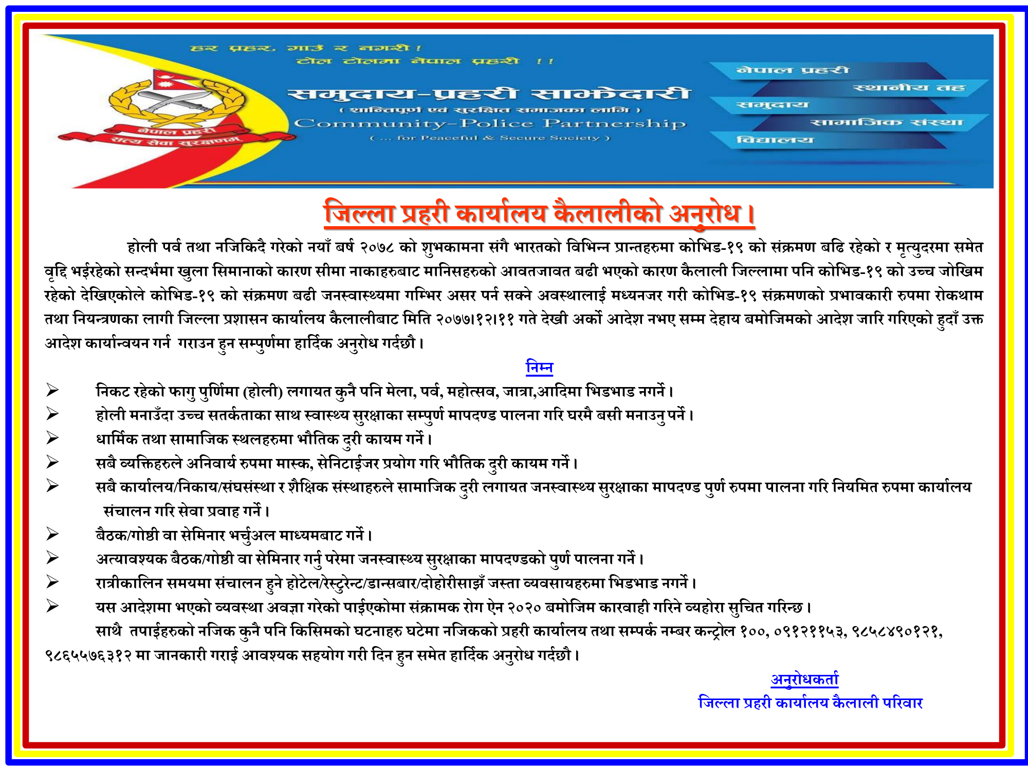 धनगढी: फागु पूर्णिमा (होली) पर्वमा भिडभाड नगर्न सर्वसाधरणलाई जिल्ला प्रहरी कार्यालय कैलालीले आग्रह गरेको छ। प्रहरीले एक सुचना निकाल्दै छिमेकी मुलुक भारतमा कोरोना संक्रमण बढ्दै गएको अवस्थामा जिल्लामा संक्रमणको रोकथाम तथा नियन्त्रणका लागि होली पर्वमा भिडभाड नगर्न तथा स्वास्थ्य मापदण्ड अपनाउन आग्रह गरेको हो ।
