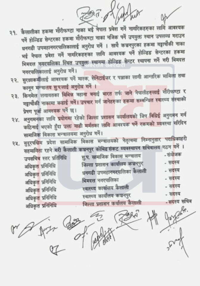 बैठकले भारतबाट फर्किनेहरूलाई गौरीफन्टा सीमा नाका र गड्डा चौकी नाकामा स्वास्थ्य चेक गरी सम्बन्धित पालिकाहरूमा पठाउने, विगतमा सञ्चालित आइसोलेसन, क्वारेनटाइनलाई फेरी सक्रिय बनाउने, छोटो दुरीका सवारी साधनहरूलाई कैलाली कञ्चनपुरमा जोर बिजोर प्रणालीमा सञ्चालन गर्ने , होटेल रेस्टुरेन्ट बिहान ८ बजे देखी राती ८ बजे सम्म मात्रै सञ्चालन गर्ने दिने लगायतका २५ निर्णय गरेको छ ।