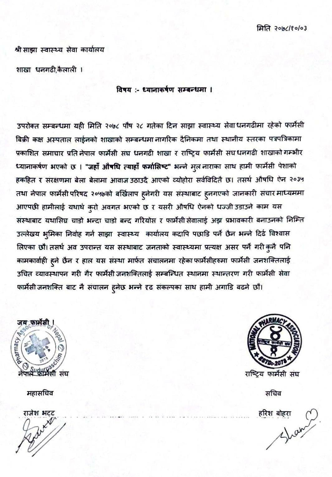 मिति २०७८ पौष २८ गतेका दिन साझा स्वास्थ्य सेवा धनगढीमा रहेको फार्मेसी बिक्री कक्ष अस्पताल लाइनको शाखाको सम्बन्धमा पत्रपत्रिकामा प्रकाशित समाचार प्रति राष्ट्रिय फार्मेसी संघ सुदूरपश्चिम प्रदेश धनगढी शाखा र नेपाल फार्मेसी संघ धनगढी शाखाको गम्भीर ध्यानाकर्षण भएको जनाएको छ ।