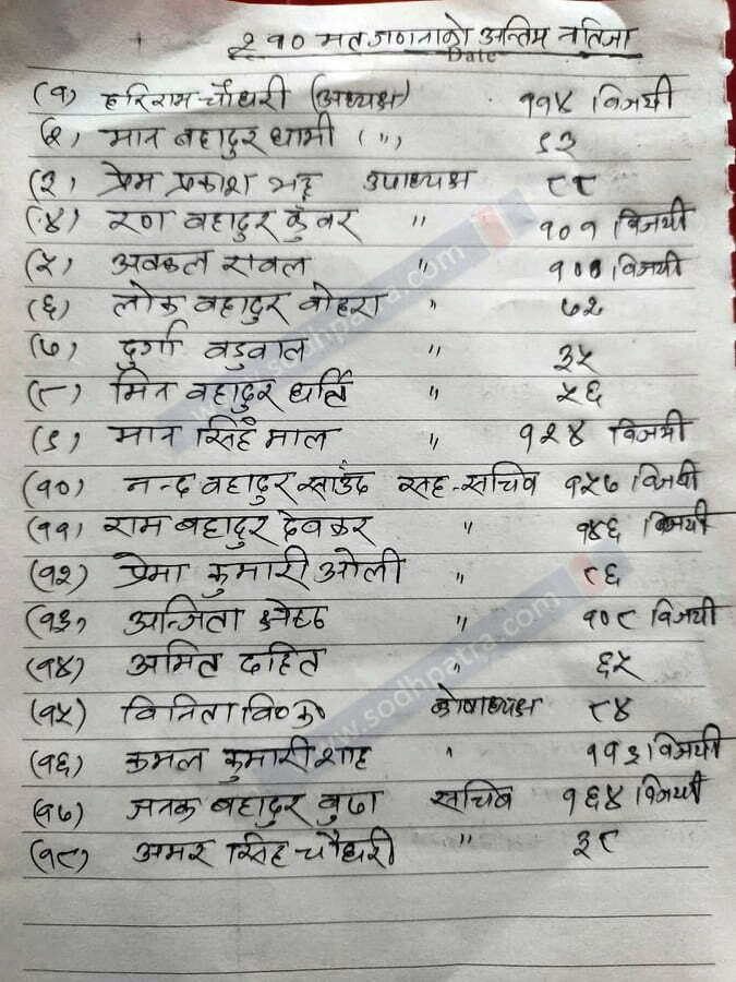 जस अन्तरगत अध्यक्ष पदकालागि राष्ट्रियसभा सदस्य हरिराम चौधरी ‘उत्सव’ (कैलाली)ले जम्मा २१० मतगणनामा ११४ मत ल्याइ बिजयी भएका छन्। उनका प्रतिस्पर्धी सुदूरपश्चिम सरकारका पर्यटन मन्त्री समेत रहेका मानबहादुर धामी (दार्चुला)ले ९३ मत मात्रै पाए।