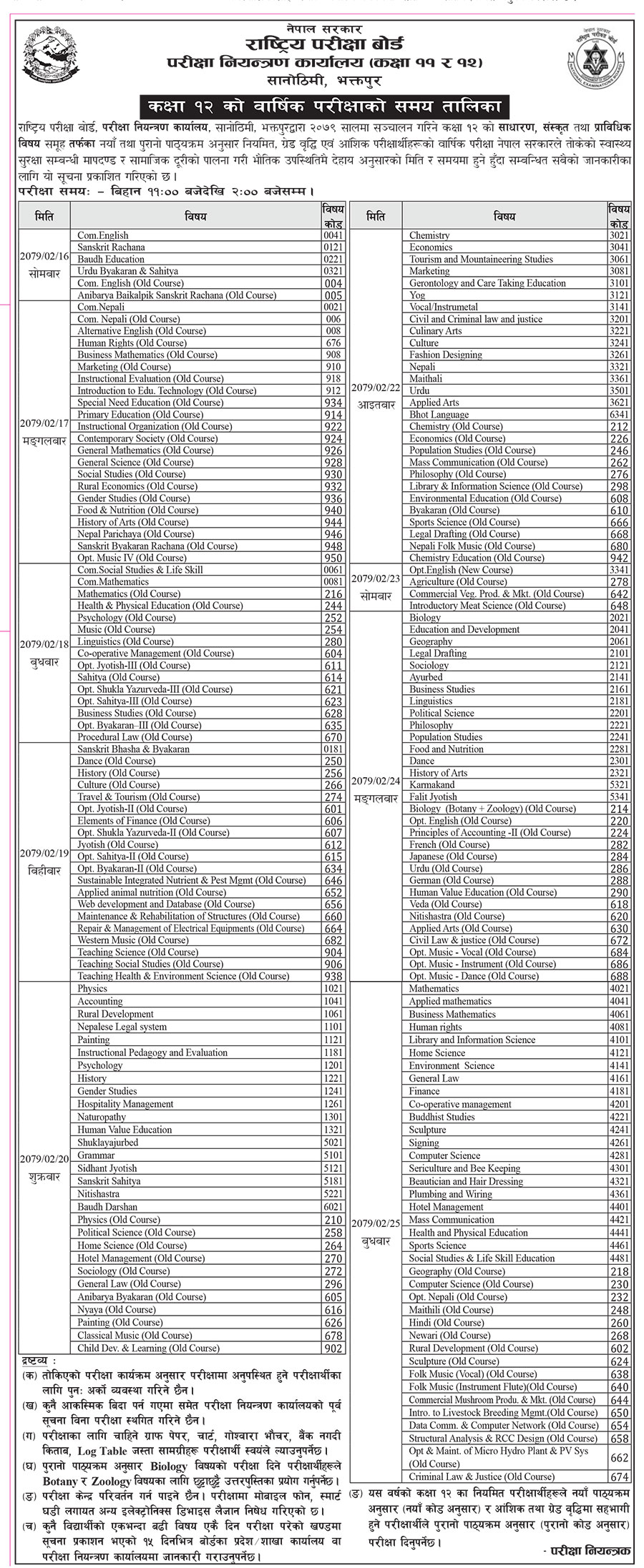 राष्ट्रिय परीक्षा बोर्ड, परीक्षा नियन्त्रण कार्यालय भक्तपुरले २०७९ जेठ १६ गतेदेखि हुने परीक्षाको समय तालिका सार्वजनिक गरेको हो।