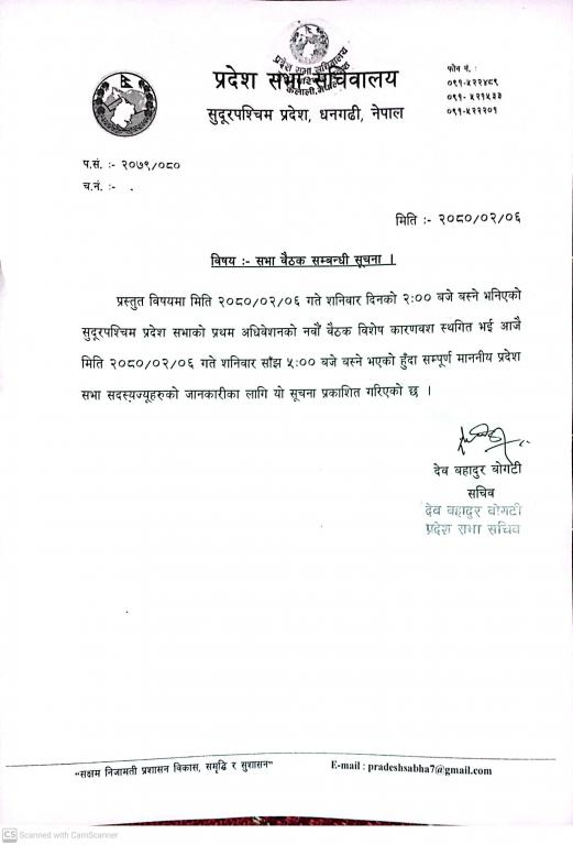 प्रदेश सभा सचिवालयले सूचना टाँस गर्दै विशेष कारणबस बैठक साँझसम्मका लागि स्थगित गरिएको जानकारी दिएको छ । ‘शनिबार दिनको २ बजे बस्ने भनिएको प्रदेश सभाको प्रथम अधिवेशनको नवौ बैठक विशेष कारणवस स्थगित भई आज साँझ ५ बजे बस्ने सूचनामार्फत जानकारी गराइन्छ’ सचिवालयले टाँस गरेको सूचनामा भनिएको छ ।