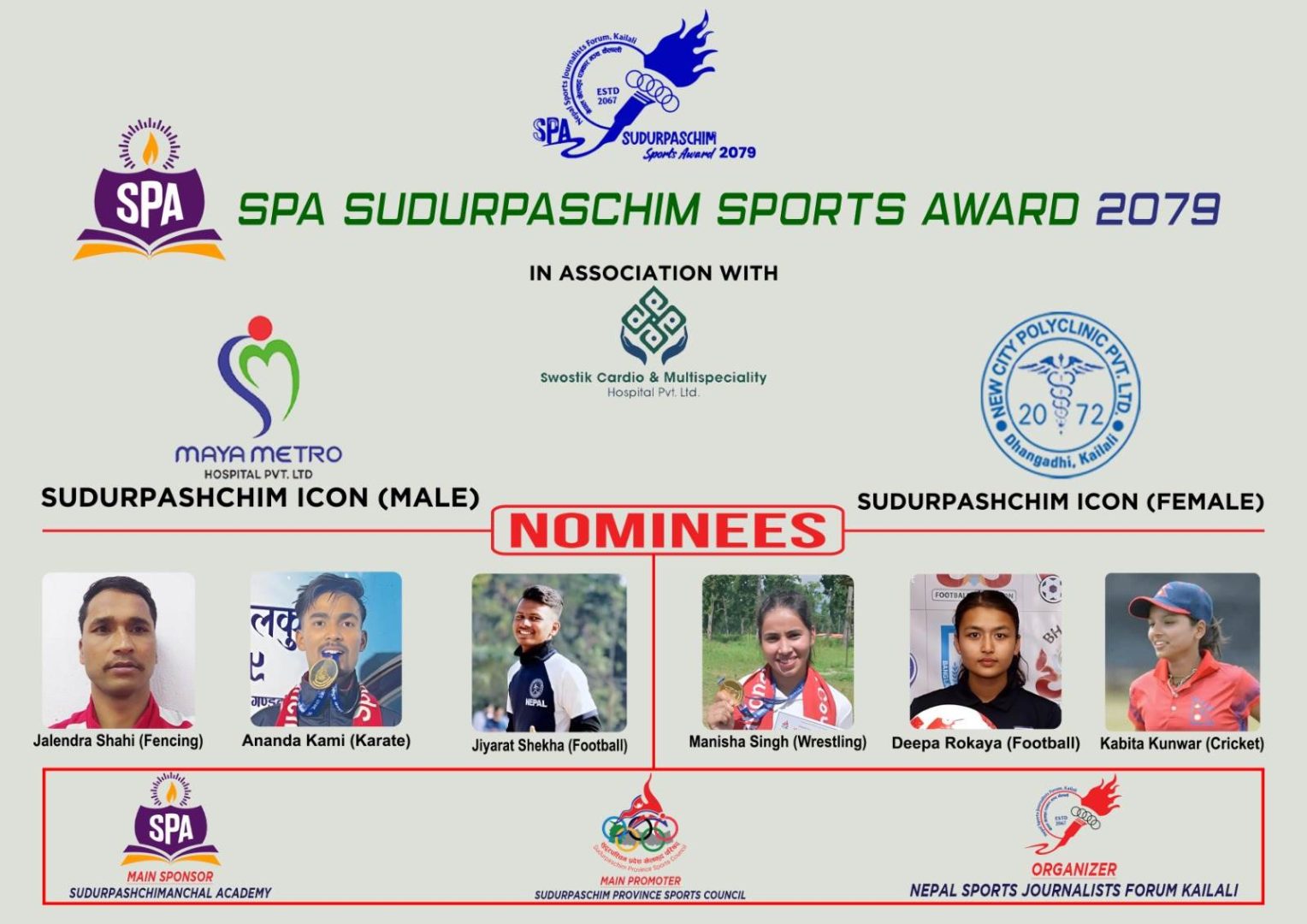 असार ८ गते हुने ‘चौथो एसपिए सुदूरपश्चिम स्पोर्टस अवार्ड २०७९’ लाई सुदूरपश्चिमाञ्चल एकेडेमीले मुख्य प्रायोजन गरेको छ । मुख्य सह प्रायोजकमा धनगढीको स्वस्तिक अस्प्ताल रहेको छ । चौथो संस्करणको ‘एसपीए सुदूरपश्चिम स्पोर्टस अवार्ड २०७९’ मार्फत वर्ष २०७९ मा उच्च प्रदर्शन गरेका राष्ट्रिय तथा अन्तर्राष्ट्रिय क्षेत्रमा सफल खेलाडी र प्रशिक्षक गरी विभिन्न ८ विधामा अवार्ड प्रदान गरिने छ । उत्कृष्ट खेलाडी पुरुष र महिला, उत्कृष्ट प्रशिक्षक, वर्ष युवा खेलाडी, स्पेसल अवार्ड, लाइफ टाइम एचिभमेन्ट अवार्ड, सुदूरपश्चिम आइकन महिला र पुरुष विधामा अवार्ड प्रदान गरिने भएको हो । उत्कृष्ट खेलाडी पुरुष र महिला विधाका विजेतालाई ३५÷३५ हजार, उत्कृष्ट प्रशिक्षकलाई ३० हजार, वर्ष युवा खेलाडी, स्पेसल अवार्ड र लाइफटाईम एचिभमेन्ट अवार्डका विजेतालाई २५÷२५ हजार नगदबाट पुरस्कृत गरिने आयोजक नेपाल खेलकुद पत्रकार मञ्च कैलालीले जनाएको छ । यस्तै सुदूरपश्चिम आईकन महिला र पुरुष विधाका विजेतालाई नगद २० हजार सहित ट्रफी, मेडल र प्रमाणपत्र प्रदान गरिनेछ । अवार्डको चौथो संस्करणको तयारी तीव्र रूपमा भइरहेको छ । प्रायोजक प्रर्वद्धकहरुको खोजी गर्दै अवार्डको तयारी अघि बढेको छ । अवार्डमा सुदुरपश्चिम आईकन पुरुष विधालाई माया मेट्रो हस्पिटल र सुदुरपश्चिम आईकन महिला विधालाई सिटी पोलिक्लिनिकले प्रायोजन गरेको छ ।
