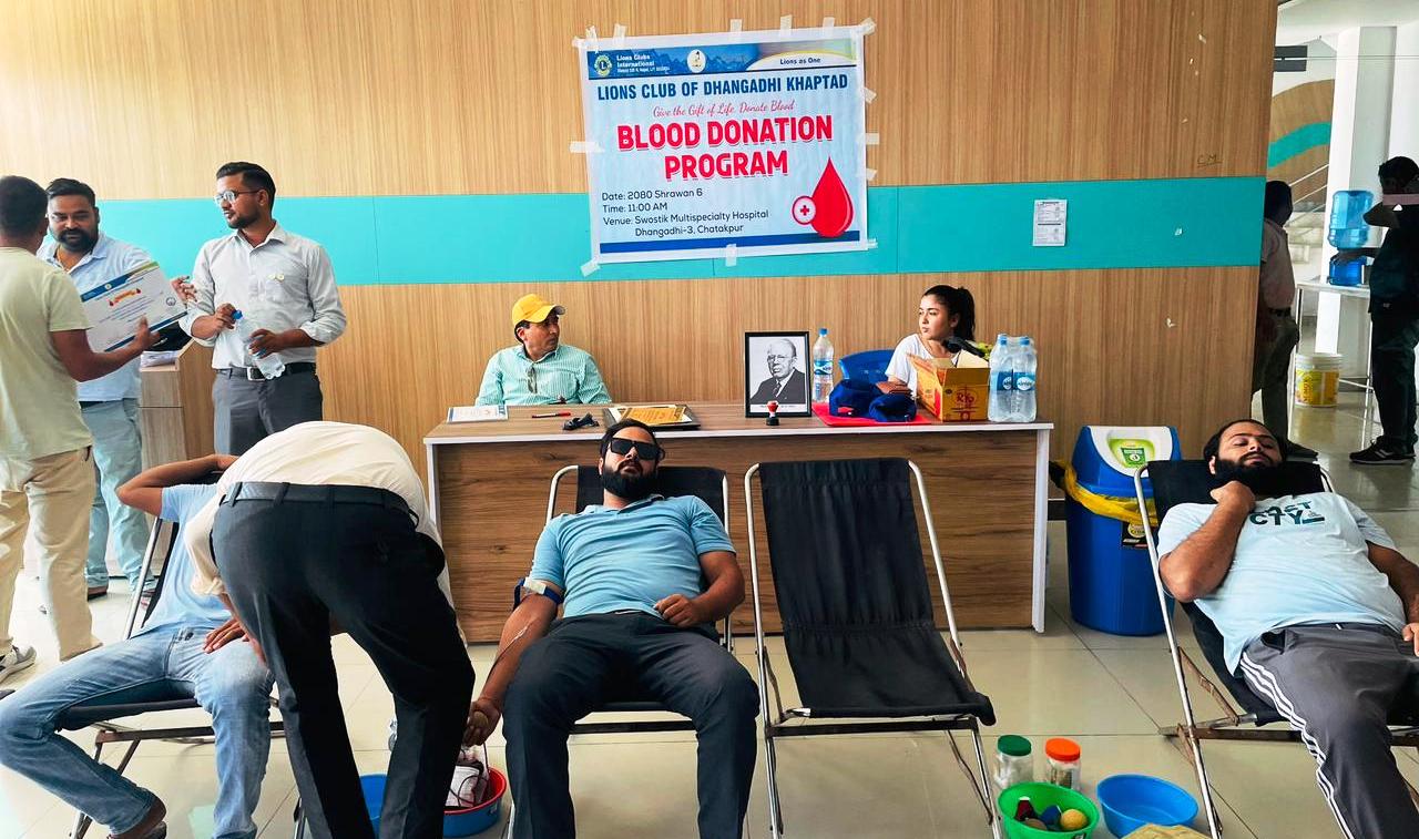 जीवनको उपहार दिनुहोस्, रक्तदान गर्नुहोस् भन्ने मूल नाराका साथ लायन्स क्लब अफ धनगढी खप्तडले आयोजना गरेको उक्त कार्यक्रमका लागी स्वस्तिक अस्पतालले एसी सहितको हल उपलब्ध गराएको थियो ।