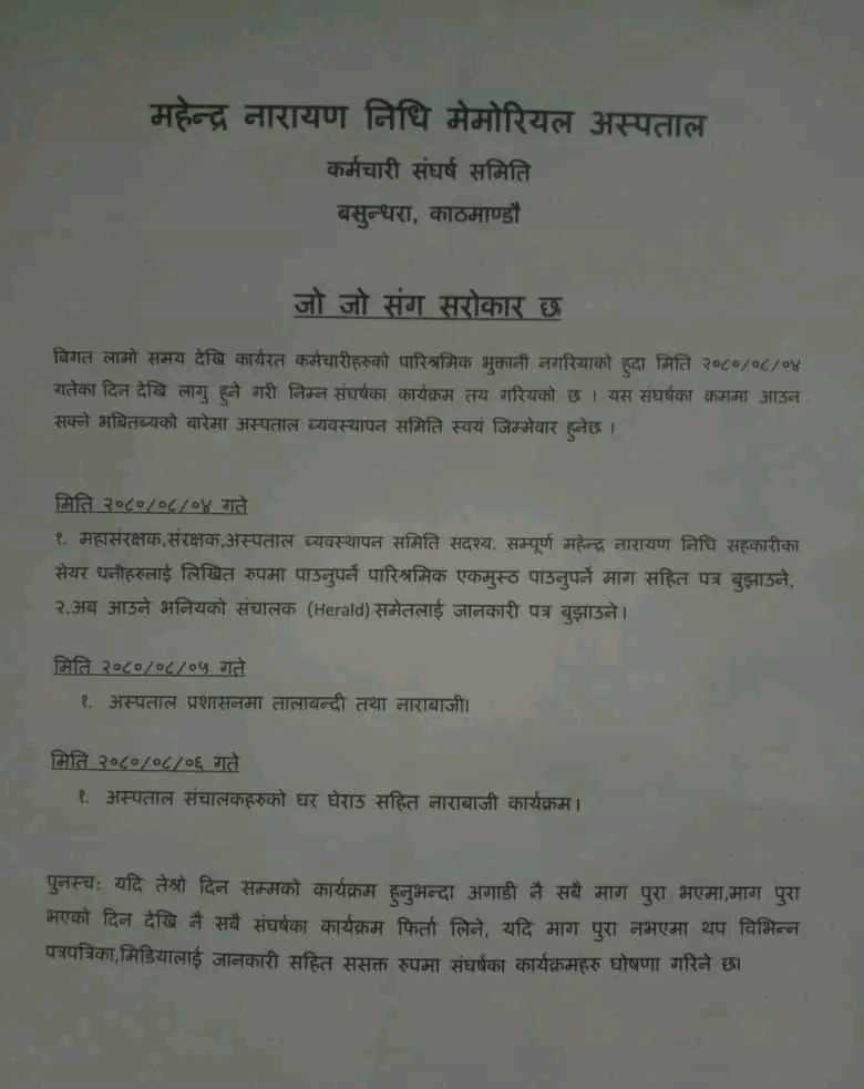 मंसिर ४ गते महासंरक्षक, संरक्षक, अस्पताल व्यवस्थापन समिति सदस्य र सम्पूर्ण महेन्द्रनारायण निधि सहकारीका शेयर धनीहरुलाई लिखित रुपमा पाउनुपर्ने पारिश्रामिक एकमुुष्ट पाउनुुपर्ने मागसहित पत्र बुुझाउने, ५ गते अस्पताल प्रशासनमा तालाबन्दी तथा नारावाजी गर्ने र ६ गते अस्पताल सञ्चालकको घर घेराउ गर्ने कार्यक्रम तय गरिएको छ ।