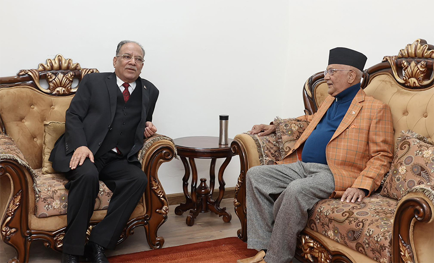 काठमाडौं : प्रधानमन्त्री पुष्पकमल दाहाल प्रचण्ड र नेकपा एमालेका अध्यक्ष केपी शर्मा ओलीबीच मंगलबार भेट भएको छ । सिंहदरबारस्थित प्रधानमन्त्री कार्यालयमा दुई नेताबीच छलफल भएको हो । छलफलको विषय भने खुलेको छैन ।