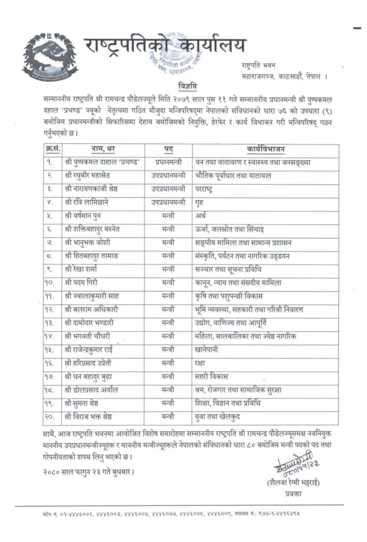 नवनियुक्त मन्त्रीहरुले राष्ट्रपति भवन शीतलनिवासमा आयोजित समारोहमा राष्ट्रपति रामचन्द्र पौडेलसँग शपथ लिएका हुन् ।