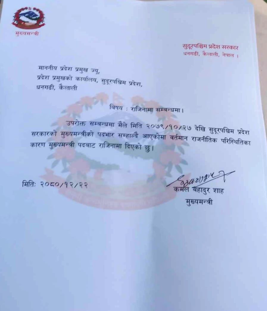 सुदूरपश्चिम प्रदेशका मुख्यमन्त्री शाहले बिहिवार दिउसो ३ बजेको प्रदेश सभाको बैठकमा विश्वासको मत लिने कार्यसूची थियो। तर, विश्वासको मत पाउने वातावरण नभएपछि साँझ ५ बजेका लागि बैठक सारिएको थियो। तर, ५ बजेपनि मुख्यमन्त्री शाहको पक्षमा बहुमत नजुटेपछि उनले राजीनामा बुझाएका हुन्।