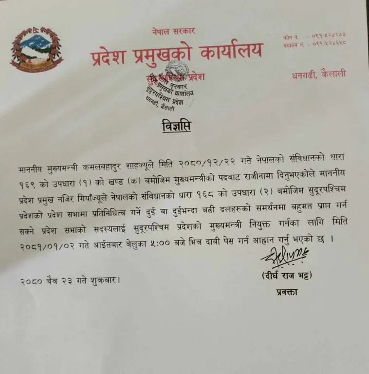‘माननीय मुख्यमन्त्री कमल बहादुर शाहले २०८० साल चैत २२ गते संविधानको धारा १६९ (१) को खण्ड (क) बमोजिम मुख्यमन्त्री पदबाट राजीनामा दिनुभएकाले माननीय प्रदेश प्रमुख नजिर मियाँ ज्युले नेपालको संविधानको धारा १६८ (२) बमोजिम सुदूरपश्चिम प्रदेश सभामा प्रतिनिधित्व गर्ने दुई वा दुई भन्दा बढी दलहरुको समर्थनमा बहमुत प्राप्त गर्न सक्ने प्रदेश सभाको सदस्यलाई सुदूरपश्चिमको मुख्यमन्त्री नियुक्त गर्नका लागि मिति २०८१ बैशाख २ गते आईतबार बेलुकी ५ बजे भीत्र दाबी पेश गर्न आह्वान गर्नु भएको छ’ प्रदेश प्रमुख कार्यालयका प्रवक्ता दीर्घराज भट्टले हस्ताक्षर गरिएको विज्ञप्तीमा भनिएको छ ।