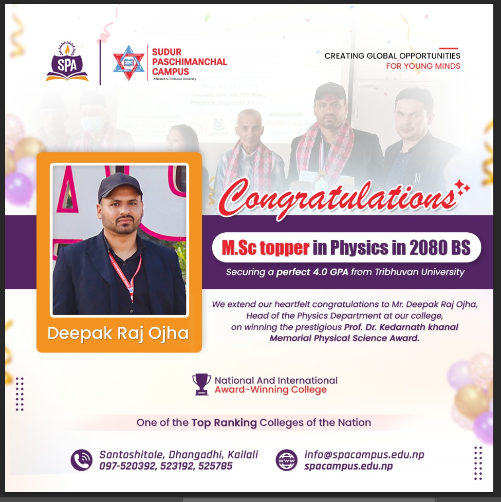 एसपिए कलेजका उप-प्राध्यापकले सर्वाधिक अङ्क पाउँदै हासिल गरेको उपलब्धिमा कलेज परिवारले पनी खुसी व्यक्त गरेको छ ।
