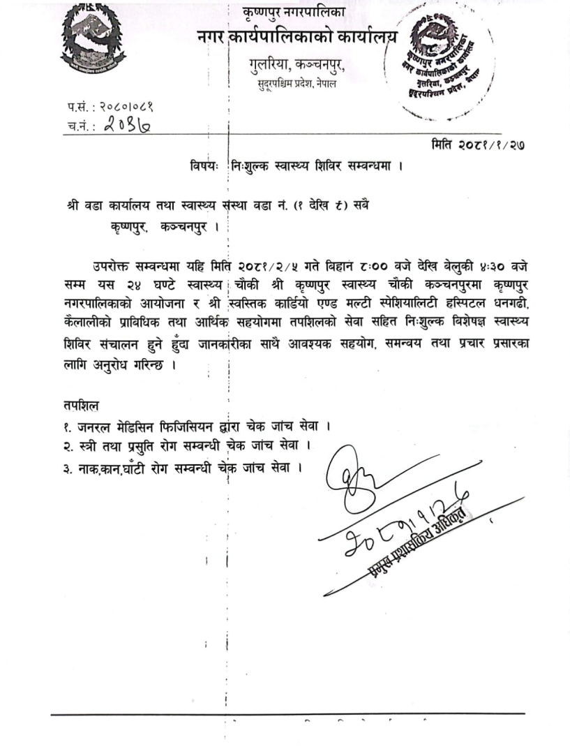 “श्री वडा कार्यालय तथा स्वास्थ्य संस्था वडा नं. १ देखि ८ सबै कृष्णपुर, कञ्चनपुर । उपरोक्त सम्बन्धमा यही मिति २०८१/२/५ गते बिहान ८ः०० बजे देखि बेलुकी ४ः३० बजे सम्म यस २४ घण्टे स्वास्थ्य चौकी श्री कृष्णपुर स्वास्थ्य चौकी कञ्चनपुरमा कृष्णपुर नगरपालिकाको आयोजना र श्री स्वस्तिक कार्डियो एण्ड मल्टी स्पेशियालिटी हस्पिटल धनगढी, कैलालीको प्राविधिक तथा आर्थिक सहयोगमा तपशीलको सेवा सहित निःशुल्क विशेषज्ञ स्वास्थ्य शिविर सञ्चालन हुने हुँदा जानकारीका साथै आवश्यक सहयोग, समन्वय तथा प्रचार प्रसारका लागि अनुरोध गरिन्छ ।”