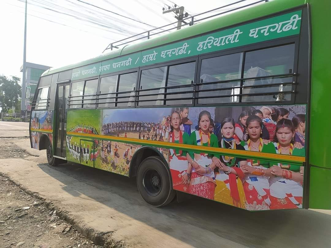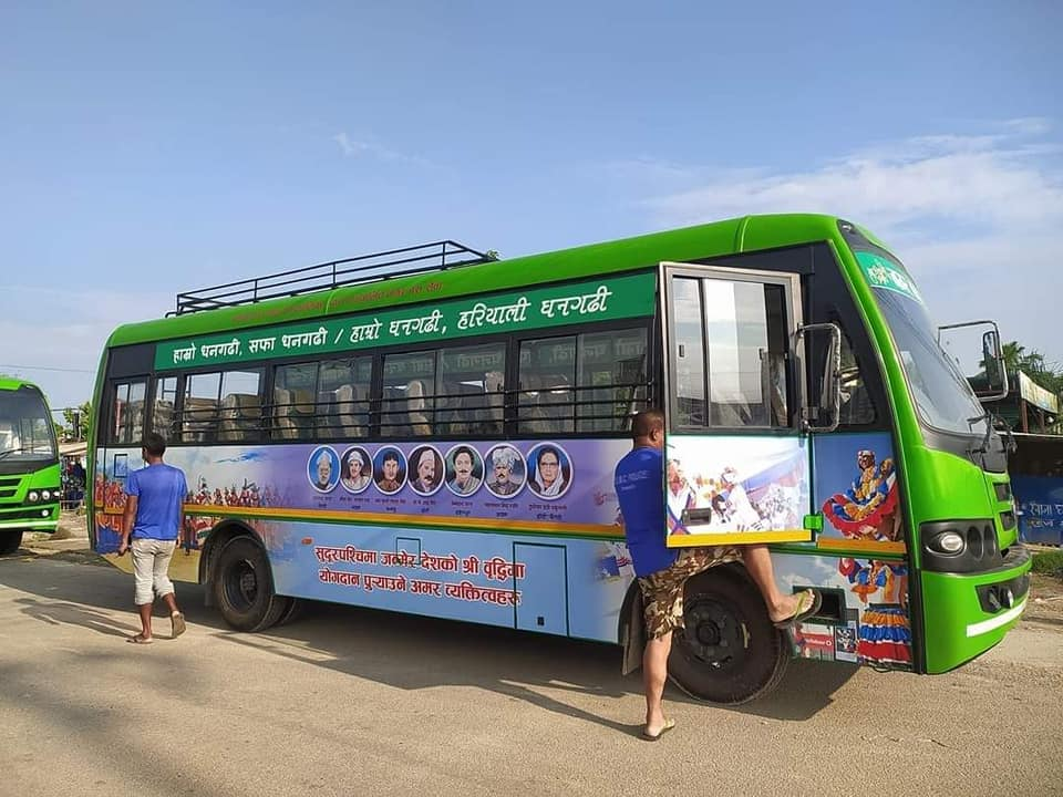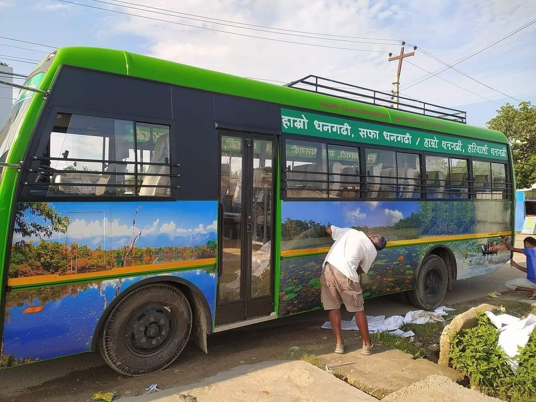 धनगढी : धनगढी उप-महानगरपालिकाले सञ्चलन गर्ने बसहरूमा सुदूरपश्चिम चिनाउने तस्बिरहरू सँगै धनगढी उपमहानगरका मेयर गोपाल हमालले थालेको अभियानहरू का नार हाम्रो धनगढी, सफा धनगढी / हाम्रो धनगढी, हरियाली धनगढी समेत छापिएका छन् ।