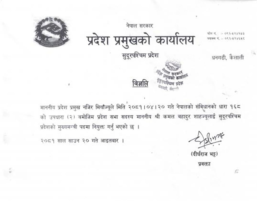 धनगढी : सुदूरपश्चिम प्रदेशको मुख्यमन्त्रीमा कमलबहादुर शाह नियुक्त भएका छन् । नेकपा एमाले र नागरिक उन्मुक्ति पार्टीको समर्थनमा शाहले आज मुख्यमन्त्रीको दाबी पेश गरेका थिए ।