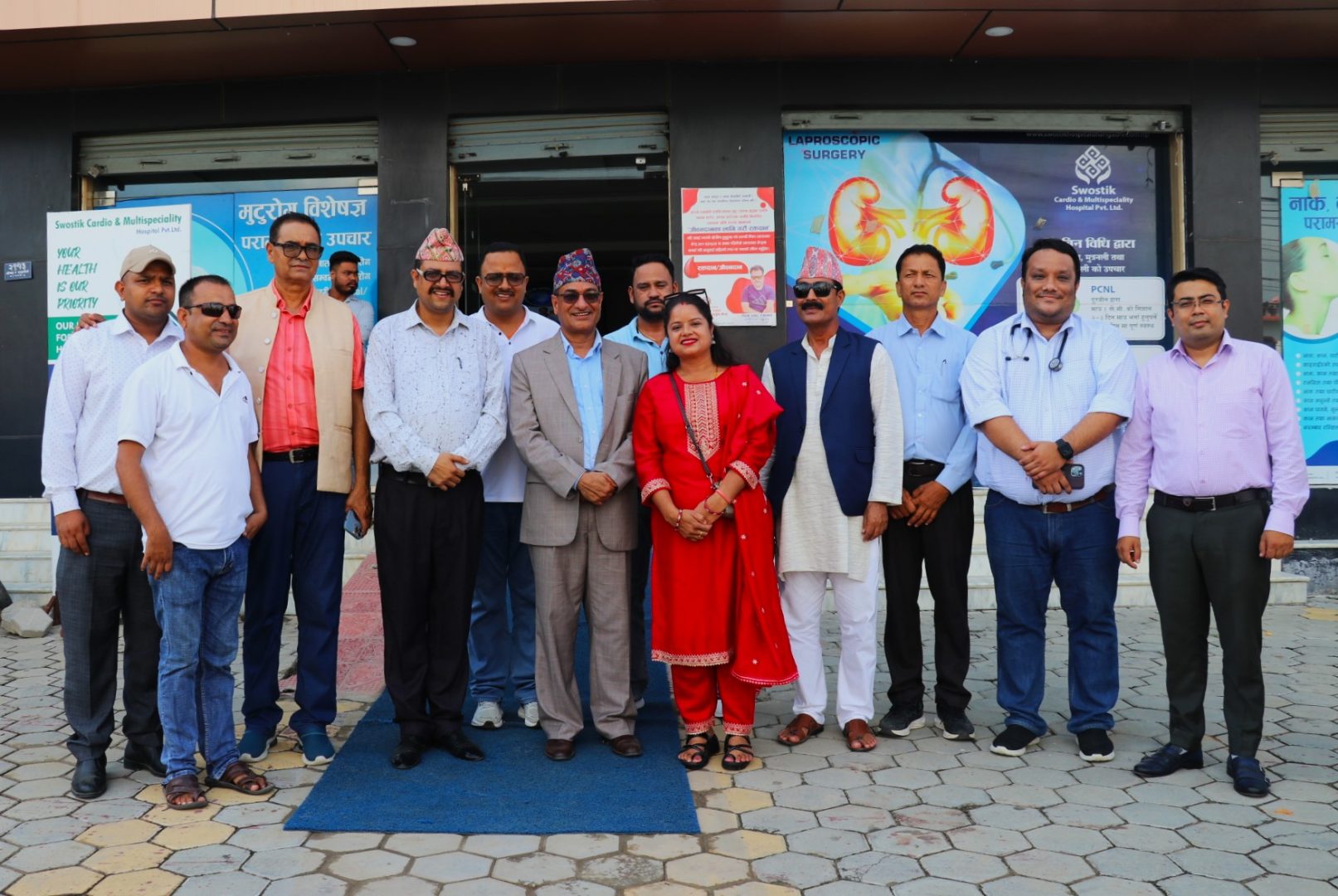 गृह मन्त्री रमेश लेखकलाई स्वस्तिक हस्पिटलमा स्वागत गर्दै हस्पिटल व्यवस्थापन टिम