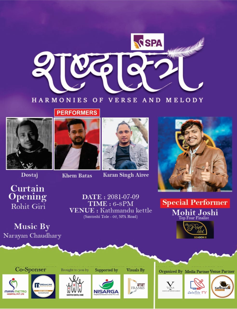 धनगढी : शब्द र संगीतको अद्भुत संगम एस.पी.ए शब्दास्त्र २.० ‘पद्य र धुनको तालमेल’ सभ्य रूपमा सम्पन्न भएको छ । शुक्रबार धनगढी–२ स्थित काठमाडौँ केटलको आनन्दित वातावरणमा सम्पन्न भएको यस कार्यक्रमले साहित्य प्रेमीहरूलाई मनमोहक साहित्यिक अनुभव प्रदान गरेको थियो ।