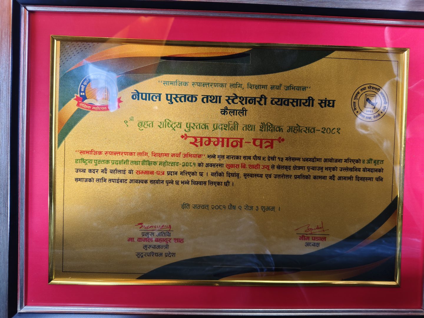 ‘सामाजिक रूपान्तरणका लागि, शिक्षामा नयाँ अभियान’ भन्ने मूल नाराका साथ यही पौष ९ देखी १५ गतेसम्म धनगढीमा आयोजना गरिएको ९ औँ बृहत् राष्ट्रिय पुस्तक प्रदर्शनी तथा शैक्षिक महोत्सव-२०८१ को उद्घाटन सत्रमा शाहीलाई सुदूरपश्चिम प्रदेश सरकारका माननीय मुख्यमन्त्री कमलबहादुर शाह मार्फत सम्मान गरिएको हो ।