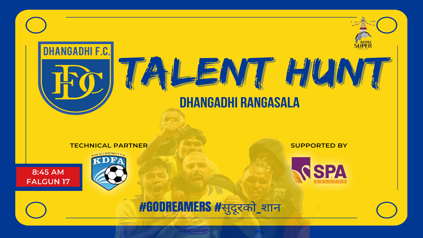 धनगढी : धनगढी रङ्गशालामा धनगढी एफ.सी. को ‘ट्यालेन्ट हन्ट’ हुने भएको छ । नेपाल सुपर लिग एनएसएलको आगामी सिजनका लागि धनगढी एफसीले शनिवार ‘ट्यालेन्ट हन्ट’ गर्न लागेको हो ।