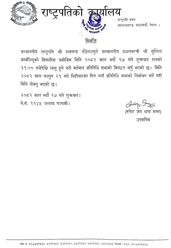 काठमाडौँ : राष्ट्रपति रामचन्द्र पौडेलले संसद विघटन गरेका छन्। राष्ट्रपति पौडेलले नवनियुक्त प्रधानमन्त्री सुशीला कार्कीको सिफारिसमा शुक्रबार राति संसद भंग गरेका हुन्।