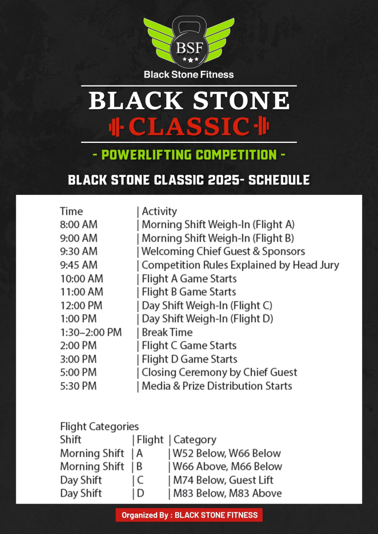धनगढी : ब्ल्याक स्टोन फिटनेस धनगढीले सुदूरपश्चिममा खेलकुद, फिटनेस र स्वस्थ जीवनशैलीलाई प्रवर्द्धन गर्ने उद्देश्यका साथ ब्ल्याक स्टोन क्लासिक पावरलिफ्टिङ च्याम्पियनसिप २०८२ आयोजना गर्ने भएको छ।