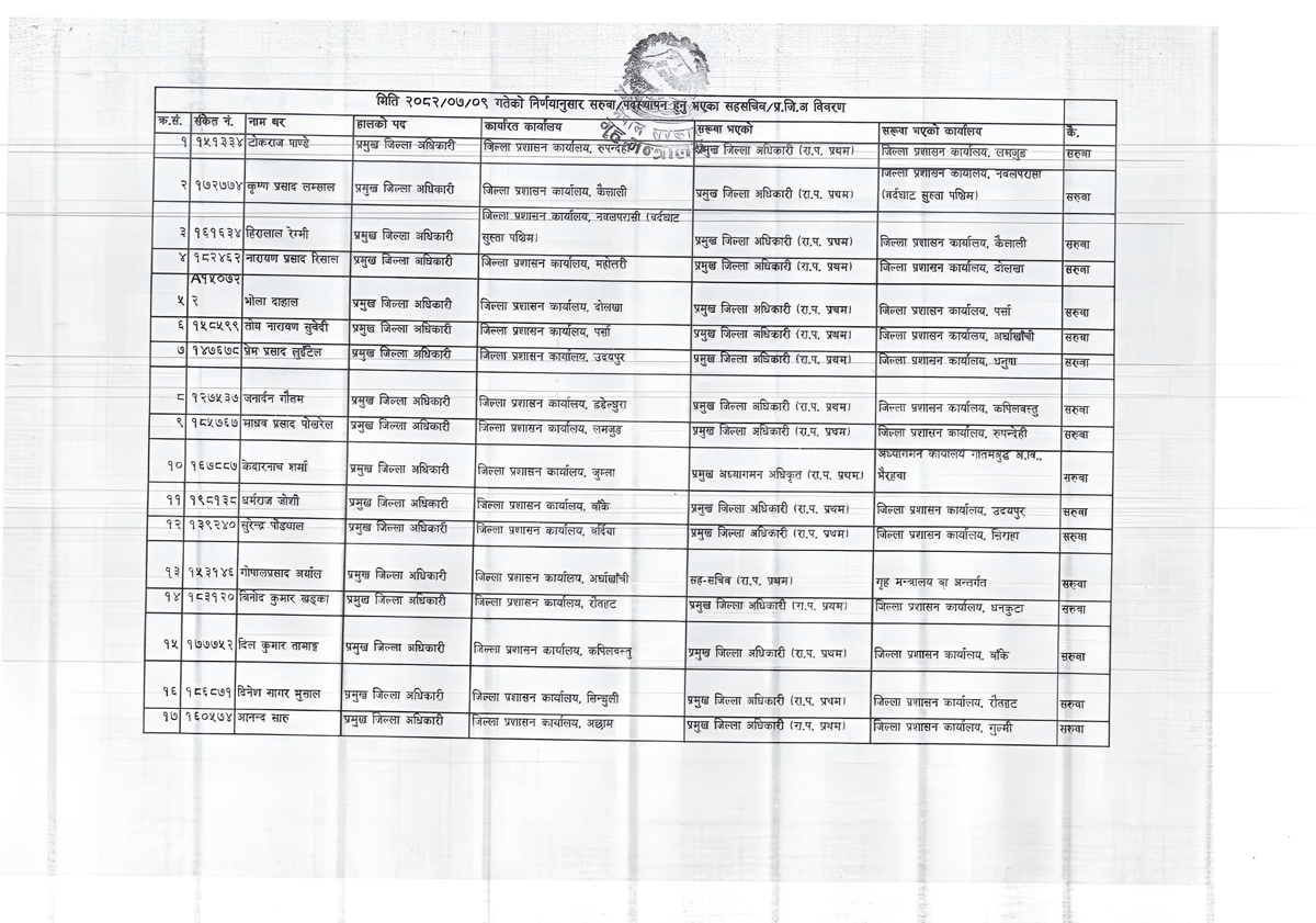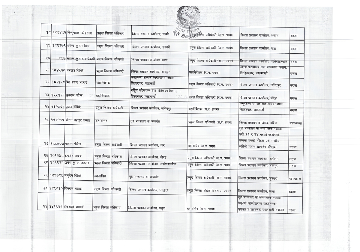 मन्त्रालयले आइतबार रुपन्देही, कैलाली, महोत्तरी, पर्सा, बाँके, बर्दिया, रौतहट र कपिलवस्तुसहितका प्रमुख जिल्ला अधिकारीहरूको सरूवा गरेको हो।