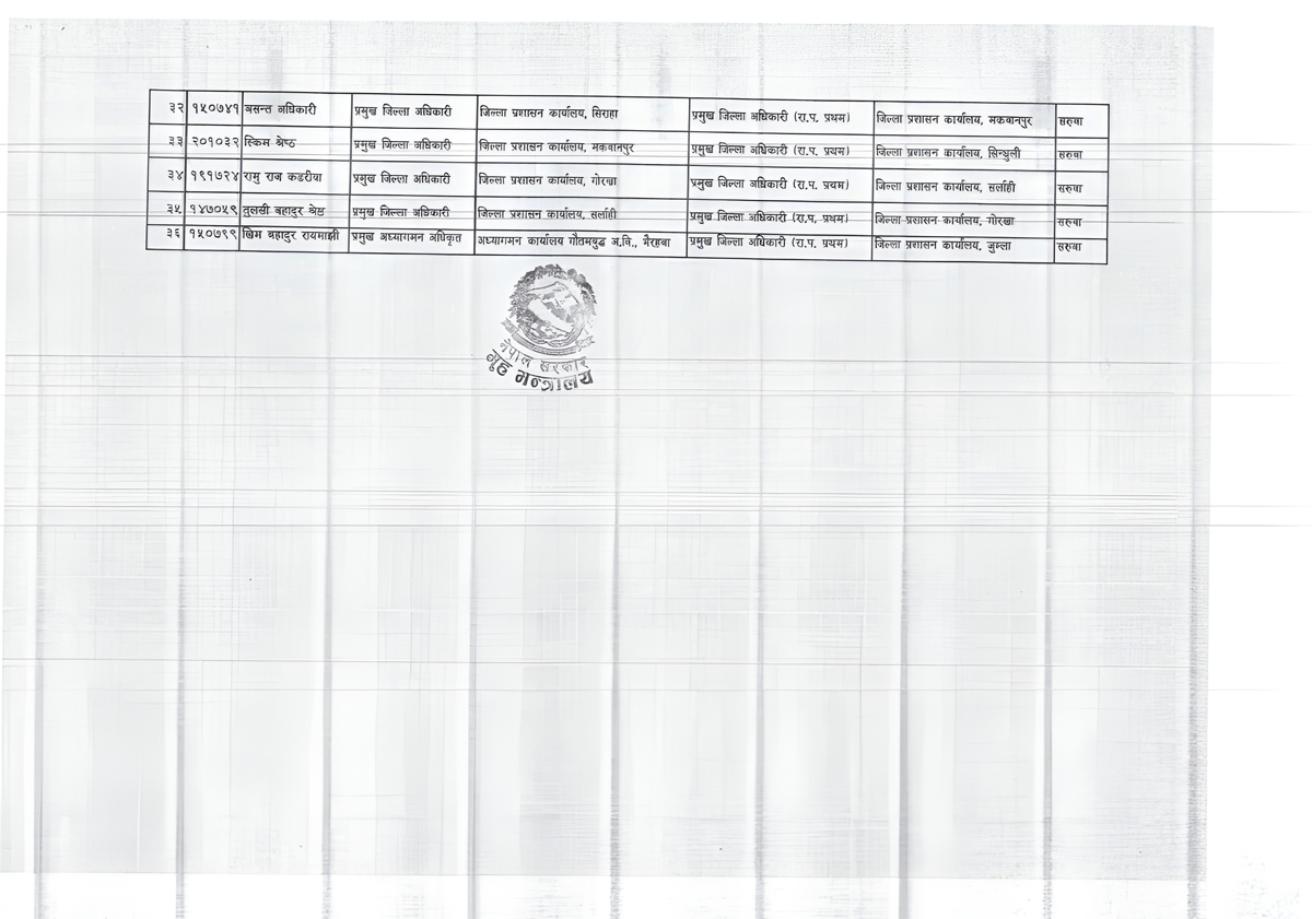 काठमाडौं : गृह मन्त्रालयले देशभरका ३६ जना प्रमुख जिल्ला अधिकारी (प्रजिअ)हरूको एकसाथ सरुवा गरेको छ।