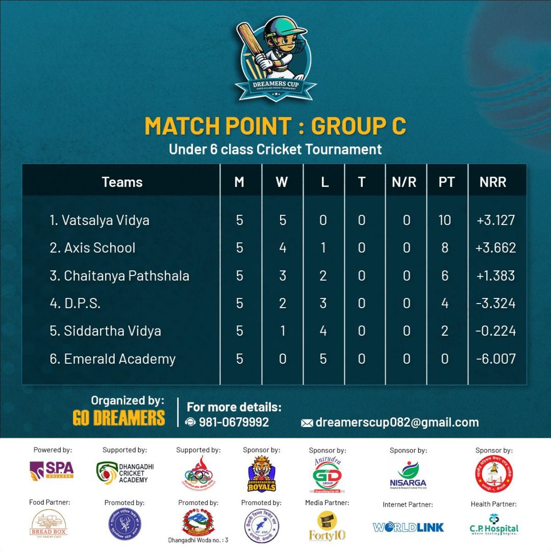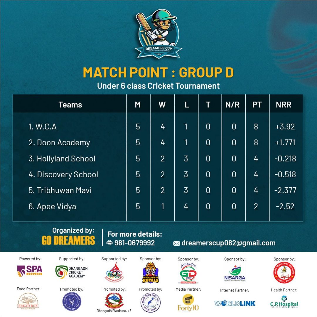 डिमर्स कप २०८२ मा सातौँ दिन सम्म आई पुग्दा दुई समूह (सी र डी) का समूह चरणका खेल सम्पन्न भएका छन् । भने निम्न विद्यालयहरूको अंक निम्नानुसार रहेको छ । म्याच पोईन्ट टेबल हेर्नुहोस् ।
