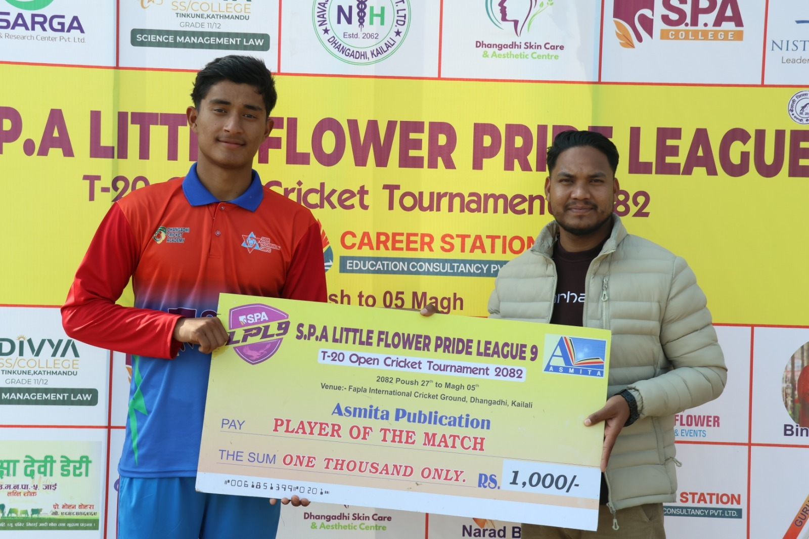 एसपिए कलेजका लागि किरन धामीले ३ विकेट लिए । ब्याटिङमा पनि १७ रनको योगदान दिएका धामी म्यान अफ दी म्याच चुनिऐ । त्यस्तै सुवोध तिवारी र विमल कटुवालले समान दुई दुई विकेट लिए ।
