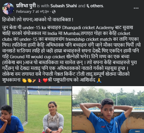 त्यो समय मुम्बई टुरमा सहभागी खेलाडी प्रतिश जि.सी.की आमाले लेखेको भावनात्मक अनुभूतिमा उल्लेख थियो,